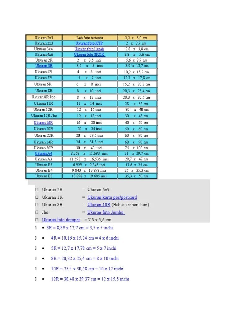 Pada kesempatan ini saya akan sajikan daftar secara lengkap ukuran foto di atas.